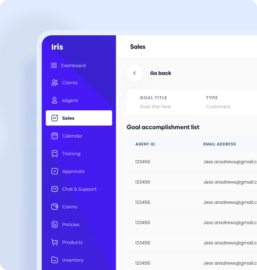 With Iris, you can set KPIs for sales agents, track their performance in real-time, and get detailed reports for all policies and claims.